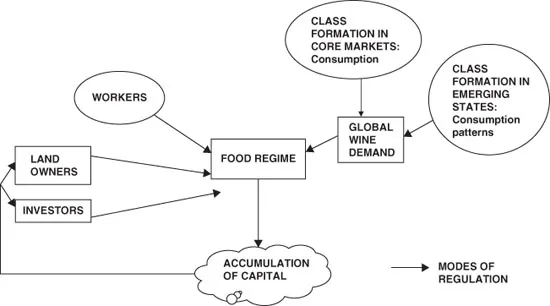 When applied to wine (see figure 2), variants of regulationist theory postulate that a global industry is shaped by numerous structural factors. Change and stability in that industry is attributed to dynamics caused by “the differing fortunes of consumers, investors, landowners and workers.” Consequently, the task of researchers is to study the “relationship between capital, class formation and accumulation across and within different scales” (Overton and Murray 2013, 703); that is, “the relationship forged between key buyers (and/or owners) in the core country markets and the producers and suppliers in the countries of the global semi-periphery” (Gwynne 2008b, 98–99; see also Goldfrank, Korzeniewicz, and Korzeniewicz 1995). Regulationists thus see relations between growers and wineries as crucial to the external positioning of products in the “global wine consumption space” (Pritchard 2002, 187). Authors who develop and promote such interpretations highlight increases in the global demand for wine and shifts within that demand (Anderson, Norman, and Wittwer 2003, 2004). Their research often seeks to identify change in consumption habits in states where historically high quantities predominated (e.g., France). They generally attribute such change to exogenous shifts in social hierarchies and ways of life. But such research also closely examines new markets for wine, in particular those linked to the development of a middle class in emerging states such as China (Banks and Overton 2010; Parcero and Villanueva 2011; Overton, Murray, and Banks 2012). The overall conclusion regulationists draw is that companies based in the New World have taken advantage of globalization by adjusting their strategies appropriately. In so doing they have deepened a position of comparative advantage based on the availability of suitable land and technologies that enables them to produce wine of standardized qualities while reducing production costs (Campbell and Guibert 2006; Campbell 2007; Cox and Bridwell 2007; Gwynne 2008a, 95), thereby benefiting mechanically from upscaling (Gwynne 2006; Gwynne 2008b; Overton and Murray 2013). From this angle, regulationists see the reform of the EU’s wine policy as simply an adaptation of European production and processing to a regime change that had already occurred in the global economy of wine (Meloni and Swinnen 2012).