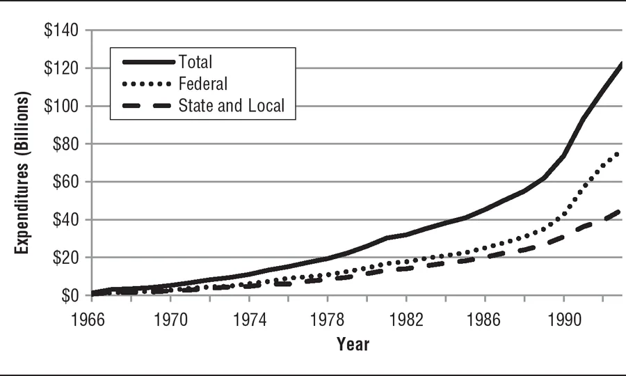 Tennessee’s experience is illustrative of this coalition-forming process in order to solve major health care problems. Looking specifically at the state-federal dyad, when Congress adopted Medicaid in 1965, it limited eligibility to the required categories, “the aged, the blind, the disabled, and families with dependent children.”23 With the addition of some optional categories, such as “medically needy” (members with characteristics of one of the broad Medicaid categories, such as aged, disabled, or families with children but who do not meet the income requirements for assistance),24 Tennessee’s enrollment had reached 410,525 in 1988.25 In 1990, Congress required the states to cover all children in low-income families as a condition of receiving Medicaid funds,26 and Tennessee obliged; by 1993, Tennessee’s Medicaid enrollment was 758,574.27 Total Medicaid expenditures in Tennessee rose from less than $1 billion in FY 1987–1988 to over $2.8 billion in FY 1992–1993.28 Putting those numbers into a statewide economic context, in FY 1989–1990, Tennessee spent 41.7 percent of its total budget on health and social services, and its 4.8 million citizens averaged a per capita income of $15,900.29 By 1992, the state was spending 50.5 percent of its state budget on health and social services, the population had grown only by about 200,000, and the per capita income was $17,200.30