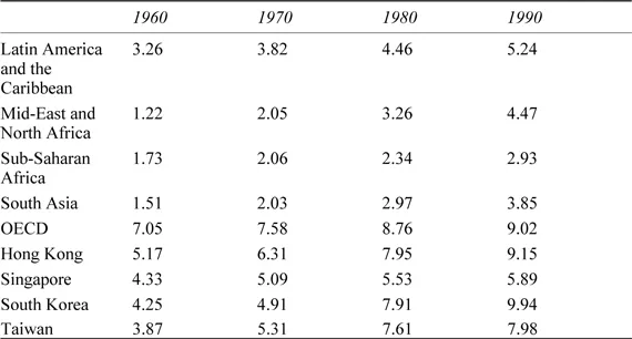 On the basis of the high participation in primary and secondary education the stock of human capital in the tiger economies increased notably in subsequent years. By 1990, the mean years of schooling attained by the adult population exceeded nine years in both Hong Kong and South Korea, putting these two economies on a par with the industrialised countries of the OECD (see Table 1.2). Taiwan was not far behind. In Singapore, human capital measured as schooling attainment also grew, but here less fast. Nevertheless, schooling and higher education in Singapore have rapidly expanded in recent years, to the point where the skills profile of younger workers is similar to that in Northern European countries (Green and Steedman 1997); moreover a very wide expansion of training courses in the 1980s and 1990s was aimed at filling the needs of older workers with less schooling. In other developing countries outside what was the Soviet bloc, while the stock of human capital has increased over the years, it began at a lower level and failed to catch up on the educational lead of the Four Tigers.