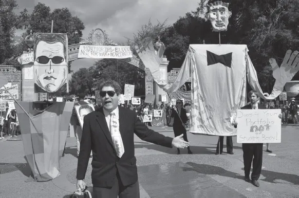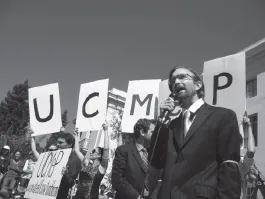 UCMeP followed through on its pledge just a week later when, on 24 September, eleven suit-clad members of UCMeP stormed the 5,000-person rally at UC Berkeley. The militantly-neoliberal rhetoric of their speeches and posters (which bore messages like ‘Diversify Your Portfolio, Not the Student Body!’ and ‘Public Education = Communist Putsch’) elicited a mix of boos and knowing laughter from the massive crowd gathered that day on Sproul Plaza, the birthplace of the 1960s’ Free Speech Movement. The ambivalent mood soon abated when UCMeP’s spokesperson announced:
