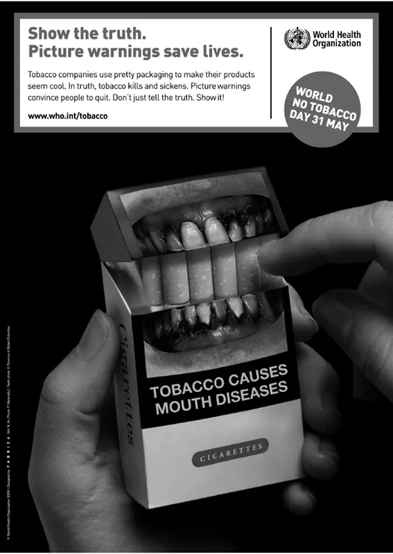 How an image ecosystem communicates meaning has been the subject of scholarly debate for many decades. Faigley et al.,4 for instance, believe that the act of communicating with images is similar to the rhetorical act of communicating with text. They essentially argue that an image is text. However, the opposite is more accurate: text is image. That is, text is a written or typeset group of words that comprise letters that are visual symbols with phonetic sounds associated with them. As Saussure describes it, the written word is a âgraphic representation of languageâ5âan image. And, while we cannot reduce all images to text, many of the theories we use to analyse how text conveys meaning can also be used to analyse images. For instance, as the rhetorician moves (movere), instructs (docere), and delights (delectare),6 the communication designer also uses images to inform, entertain, or persuade the user to adopt or change a belief or behaviour. Consider the image in Figure 2 that aims to evoke a change in behaviour by showing the negative ramifications of smoking through the package design.