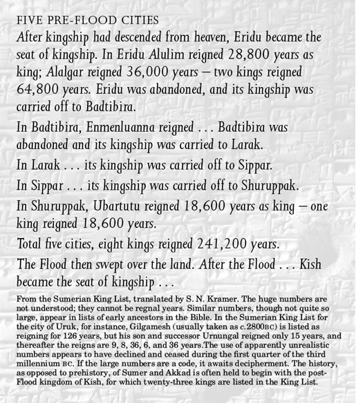 To the ancient mind in its own setting, time stretched infinitely backwards into the past as it did forwards into the future. The ancient records of past time were held in the living memory, taught by the old, learnt by the young, recited regularly and updated at intervals. The ancient world knew their own history with an objective accuracy more precise and more comprehensive than modern historians will generally allow, because their childhood training had developed the faculty of memory and taught them as second nature how to interpret and operate their memory systems. Most of the ancient memory systems died with those who knew them, but a few were partly written before their guardians had vanished. Of those, just one or two have survived by chance to tantalise the modern world with an expectation of mystery where the ancient world had recorded fact. Modern knowledge of those systems is necessarily derived from secondary and written sources that were, and are, open to contamination as memories held in living minds were not. Remnants of the ancient memory systems survive in the lists of ancestors in the Bible and in fragments of documents such as the Sumerian King List, whose numbers presented as lives or reigns are sometimes so impossibly large that modern scholarship cannot understand them and dismisses them as myth. Remnants of the techniques by which memories were stocked and information preserved survive in the doctrine of sacred writings and in the consequent insistence on precise, literal accuracy regardless of understanding or subsequent scholarship when a document is being copied or a record transmitted.