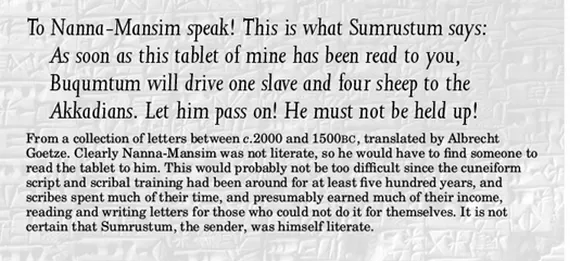 The new arrivals may well have been Sumerians and they may indeed have possessed a superior culture or ability, however politically incorrect that elitist idea may now seem. But their mere presence and the administrative crisis caused by a suddenly increased population would have been quite enough by themselves to set the storekeepers of Uruk searching for a solution to a predicament which threatened their craft, their livelihood and their status โ and they were not long in finding one. They developed first a pictographic script and, soon after, added a phonetic element which was the real beginning of writing as the recording of language.5 These inventions produced immediately a script that could convey a full meaning to those who knew the circumstances, but it was many centuries before a script was to emerge which could be read accurately by strangers. Population pressure provided the impetus for the invention of writing, but intellect and creativity were needed to exploit it. Whether writing was invented by the original inhabitants or by the new arrivals, or whether indeed the new arrivals were a wave of the original population is unknown: but it is now established that a long-held belief is correct and that the language of the earliest tablets is Sumerian.6