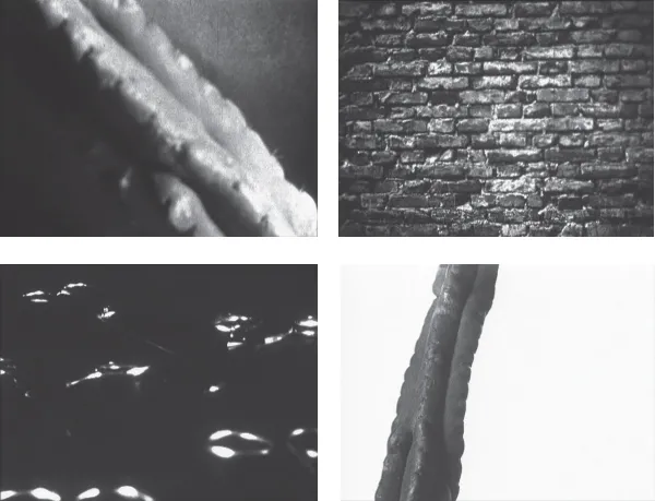 A number of the elements in the film have a haptic quality. The abrasive sound is one such element. Ordinarily in sound recording there is a distance between the microphone and the source of a sound. In this instance, however, the sound was produced through a direct contact with the filmstrip and this proximity is audible in its timbre. One might associate the scratched sound with the spines of the cactus, but in its pure physicality the soundtrack is also a testament to filmâs indexicality. In effect, the scratched sound is a tracing of the action made by the filmmakerâs hand. In this respect it is analogous to a shot made with a handheld camera, but even more direct. The significance of sound in this film is, in fact, announced from the start. The title card TEST appears superimposed over a shot of a fading light bulb filament. As the light source, and hence the image, disappear, an abrupt cut introduces the filmâs prominent soundtrack. Given that the sound derives from an optical soundtrack â which is produced by a light source that shines through the scratched surface of the emulsion â the sound as well as the image relies on light, but this first sequence of the film declares a reversal of filmâs usual order, in which the image is thought of as primary.