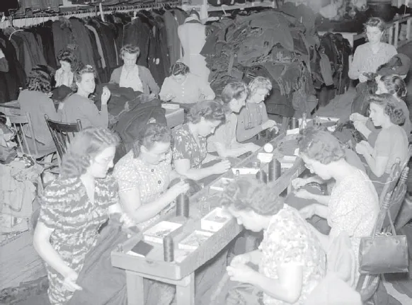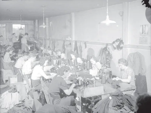 Since the early days of the Industrial Revolution, the clothing manufacturing industry, described as the “sweating system,” has been a highly exploitative enterprise, especially for women who have consistently earned much less than men (Figs. 1.2 and 1.3).10 Women (mostly Jewish and French Canadian) made up 70 percent of the early workforce, and in 1893 the National Council of Women of Canada was established “for the betterment of working conditions of female factory workers,” followed by the first general strike in 1910 by Montréal garment workers protesting their working conditions, and culminating in the massive 1937 strike of 5000 Québec women that resulted in the institution of higher wages and better working conditions.11 It was not until 1919 that the Québec government introduced a minimum wage for women.12 Immigrant women, who made up 50 percent of the garment industry, had the most poorly paid and insecure jobs, and Montréal’s clothing industry largely depended on their labour.13 Mordecai Richler’s famous protagonist Duddy Kravitz, who grew up in the Jewish ghetto around Mile End and began working in his uncle’s garment factory as a teenager, is described as follows: