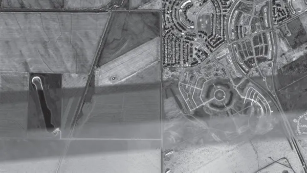 While disposition serves political and economic agendas, its control is far from absolute; it is in its own turn malleable. For Easterling, the skill of an urbanist lies in detailing and developing the active forms that shape and constitute disposition. These include multipliers (elements which multiply throughout an environment influencing its form: from tract houses to cell phones); switches (elements which serve as gateways and tipping-points in processes: highway interchanges for example); topologies (frameworks across which messages can move in specific ways: the city grid); and governors (growth protocols: plans and zoning guidelines). We can identify some of these active forms in Figure 1, in which the suburban tract homes are caught in the act of multiplying across a landscape governed by political divisions, zoning regulations, industry standards and strategies of infrastructural layout. The new development creates a topology that will guide circulation and social relationships, and that is in many ways oblivious to the topologies that preceded it; it represents a radical change in disposition, though perhaps sharing a pragmatic attitude towards the commodification of land.