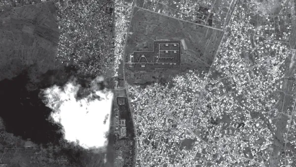 The still images reproduced here are drawn from a set of visual artworks which attempt to critically address such imaging systems and their engagement of the planet. These works were/are original works of screencaptured and projection-mapped video, originally harvested at HD resolution. The stills reproduced here have been recaptured at a much higher resolution for print publication, and they are direct captures from Google Earth Pro; they have not been manipulated or Photoshopped. It matters to the original pieces that they are composed of moving images; they record a slow progression across the Earth’s surface and project a liquid patina onto the materiality of architecture. But to focus the analysis, this chapter will address only stills.