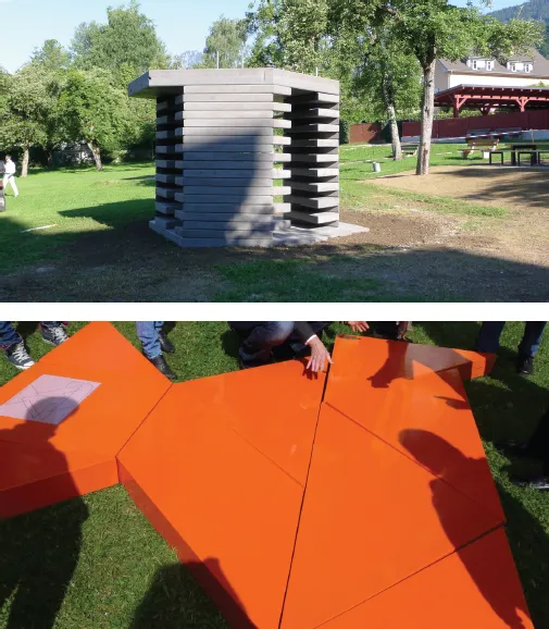 Commons come to Liezen: Liezenâs town park was previously and is still today an orchard serving as a common. A pavilion was erected there that functions first of all as a storage space for large-scale tangram pieces. The pieces were sold as a limited edition of art objects and as part of a collective work of art. As they were sold, the pavilion emptied out. The proceeds went directly back to Liezen and to the local population, and were earmarked for events which took place in the pavilion. Months before the pavilion was built, transparadiso invited the public to play tangram. While people were playing, they could discuss vital topics concerning the city and its future (see Figures 1 and 2).