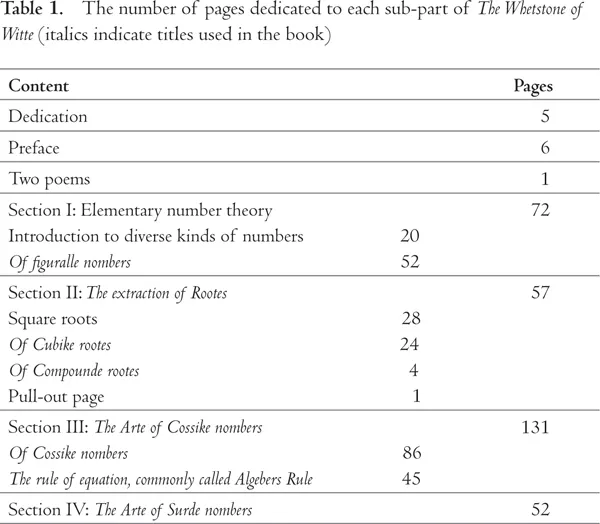The Whetstone of Witte was published in quarto format and contains 164 folios and two folded pull-out pages.2 The title page indicates the broad content of the work as being ‘the seconde parte of Arithmetike: containyng thextraction of Rootes:The Cossike practise, with the rule of Equation: and the woorkes of Surde Nombers’. These terms are explored further within this chapter.
