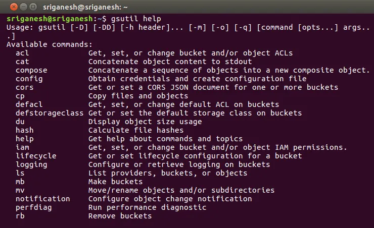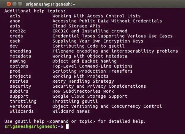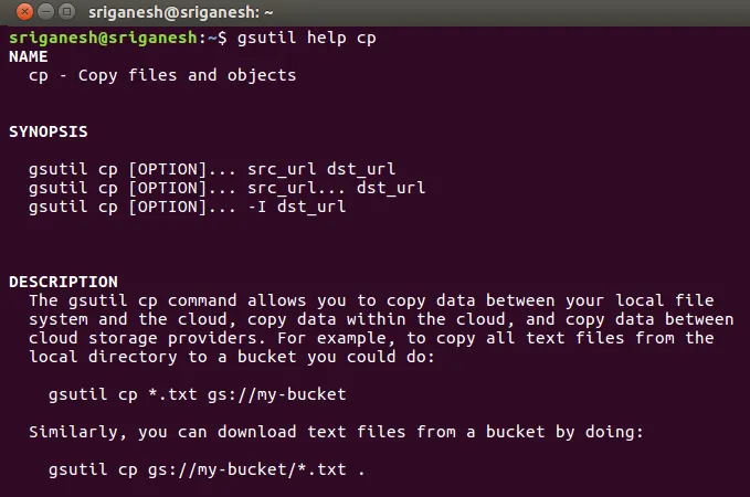 • To learn about the command-line switches or the help topics, type the following command. For example, the following command will show the list of options available in the command-line switch cp, which is used to copy files from local storage to Google Cloud and vice versa:
