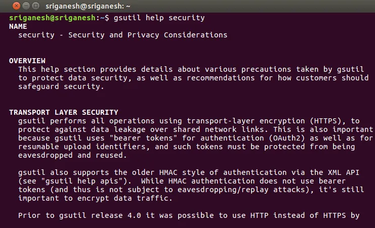• The following command will display information about how to implement secure practices and the security features of Google Cloud Storage: