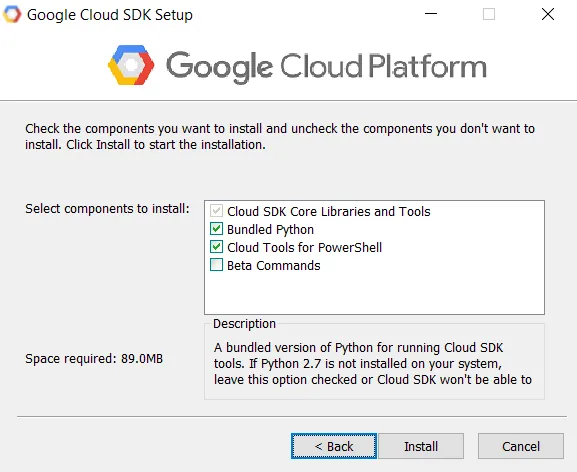 1. In the installation wizard, choose the Bundled Python option and, if it is being installed on a developer machine, then enable the Beta Commands option to try out services in beta on Google Cloud: