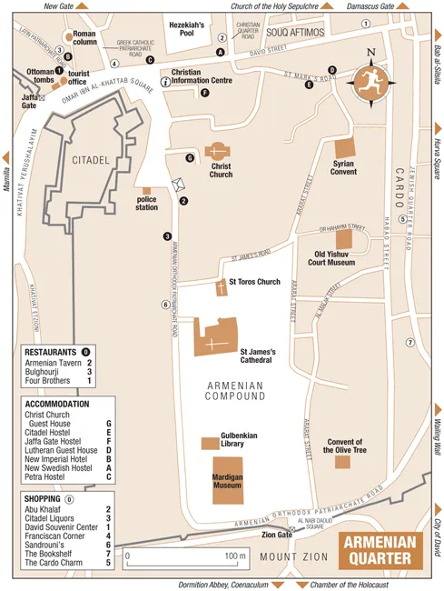 The Jaffa Gate opens up into the busy Omar Ibn al-Khattab Square full of cafĂ©s and souvenir sellers. Running east from here, David Street splits the Armenian Quarter to the south from the Christian Quarter to the north. Smaller and quieter than the Old Cityâs other three quarters, the Armenian Quarter is a city in miniature, home to a dwindling two-thousand-member community which maintains a separate language, alphabet and culture. Its attractions include the imposing Citadel (also known as the Tower of David), one of the cityâs most interesting sights â a historical and strategic stronghold where you can explore archeological remains dating back through the ages, and then come back in the evening to enjoy a state-of-the-art sound and light show. The heart of the quarter is St Jamesâs Cathedral, one of Jerusalemâs loveliest churches, whose services follow the beautiful Armenian liturgy. Also here is the worldâs very first Christian church, St Markâs in the Syrian Convent, where mass is still celebrated in the ancient Syriac tongue. At the quarterâs southern end, the Zion Gate, pockmarked with bullet holes from the fighting in 1948, provides access to neighbouring Mount Zion.