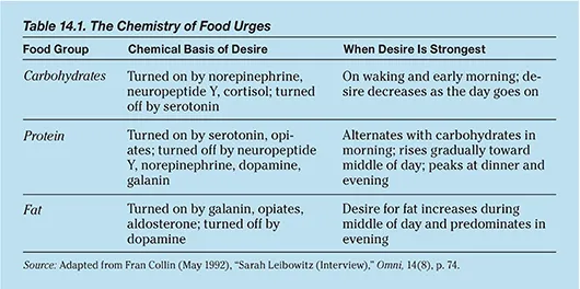 Sarah Leibowitz has identified the chemical sources of urges for specific food groups, as well as the time of day during which the urges are strongest (Collin, 1992, p. 74). A summary is shown in table 14.1.