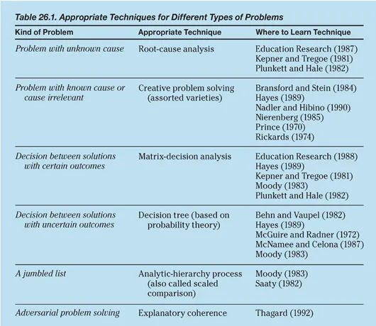 Before plunging into the details of problem-solving styles, definitions, and techniques, I want to make one point perfectly clear: the best problem solver is an expert in the subject involved. An expert might be an engineer, a consultant, a professor, a competitor, or even someone who knows the task intimatelyâthe worker. No technique is as good as an expert. So, depending upon the seriousness of the problem, consult an expert before trying one of these techniques. For example, if youâve got a cold, treat yourself, but if the symptoms are more complex, consult an expertâyour doctor. The techniques mentioned in this chapter are intended to serve either (1) when relevant expertise is unavailable or (2) when the experts have been stumped. I was once called in to help solve a problem that had stumped the experts for about nine months. A $500,000 machine had been failing in the field 50 percent of the time. By applying the right technique (root-cause analysis, described by Plunkett and Hale, 1982), I led a group of 10 experts, and we found the cause of the problem in six hours.