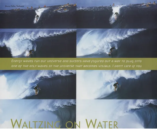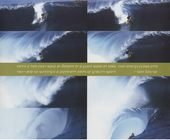 At its best, surfing is a spiritual pursuit that enriches and enlarges the individual, creating a kinship with nature thatâs unlike any other sport. Wind, weather, and tide all have a hand in creating its playing field. That playing field is ever changing; hence no two waves are exactly the same. Waves are pulses of energyâaquatic metaphors for the bigger picture that is the cosmos. Surfers catch these waves and ride them for no particular reason other than fun. There is an extreme case of adaptability going on here. Imagine trying to toss a ball into a hoop, but the hoop is ducking and weaving and in flux. This is the kind of dance partner with which surfers have to deal. And there is no permanence in the act of wave riding, nothing to show for oneâs efforts. As quickly as the wave breaks it dissipates back into the giant vastness of the sea, the cycles of the universe mirrored perfectly, the dance of surfing a dress rehearsal for all of lifeâs lessons.