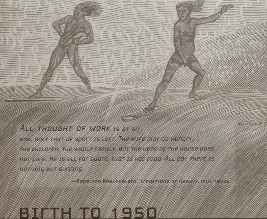 Exactly when and where surfing began is all a bit gray. Some say it started in Peru in the fifteenth century when fishermen stood up in their canoes while waves pushed them shoreward. Others tell the same story, placing it in West Africa, Thereâs the whacky theory that back in biblical times, when Moses was put in the reed basket and sent down the river, he became the worldâs first surfer. Weâre pretty sure Polynesians brought surfing from the Society Islands to Hawaii around A.D. 500 and weâre almost positive that by A.D. 1000 beâe naluâalso known as surfboard ridingâwas in full effect. The best recorded history we have starts with Captain Cookâs diaries when he sailed to Hawaii in 1778. As the story goes, the early Polynesians migrated to Hawaii and brought their oceanic lifestyle with them. Everything revolved around the seaâfrom work to food to recreation. When the surf was up they did what surfers do todayâdrop everything and paddle out. Hawaii sits right smack in the middle of the Pacific Ocean. There was no shortage of waves. You may have heard of surfing referred to as "the Sport of Kings." Well, back then it truly was. Surfers came from royal families. Theyâd paddle their oversized wili wili wood boards out to Waikiki, catch the sloping swells that seemed to go forever, and ride them shoreward with stiff, hood ornament-like styles. Back then boards were sacred. Surfers would find just the right tree, chop it down, carve it into shape with sharp stones or coral, stain it with ti root, and then lug it down to the beach. Upwards of twenty feet and weighing in over 100 pounds, they were a nightmare to drag around. Early surfers wore loincloths or nothing at all, frolicking in the fun and celebration of it all, enjoying surfing for its playfulness and sense of freedom. But when Christian missionaries arrived on the scene in the early 1800s, they decided these demonstrations of liberation threatened their still and upright ideals. They declared it impure and unethical, and consequently, surfingâs popularity diminished throughout the century.