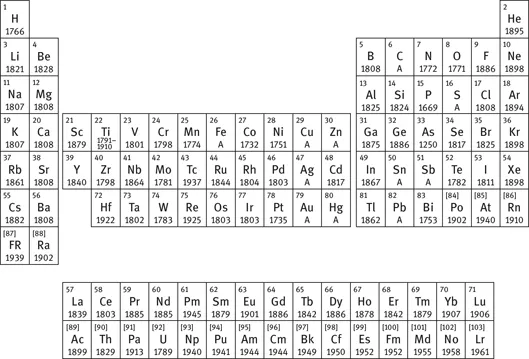 Fig. 1.1: Periodic table with year of discovery of the elements.