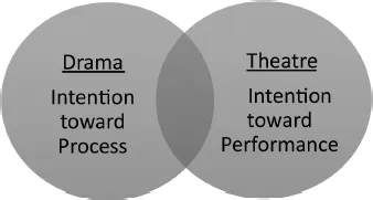 In our practice, the term “Drama-Based Pedagogy” has emerged as a productive way to describe a specific approach that uses drama techniques to teach across the curriculum in the United States public schools. Generally, practitioners and researchers refer to theatre as work that is oriented toward a performative1 product, whereas drama is work that is oriented toward a non-performative process or “process oriented” (see Figure 1). The intention of drama is often characterized as exploratory and reflective; it is work that springs from inquiry. Theatre’s intention is often focused on the creation and reception of a product for an audience. This is not to suggest that there is a fixed dichotomy between theatre and drama. Certainly, drama-based work can move toward a production, and theatre-based work can engage in reflective practice in preparation for a performance. For this book, Drama-Based Pedagogy privileges the process of drama over the product or performance of theatre. However, the practice of theatre remains a central and necessary underpinning of the work.