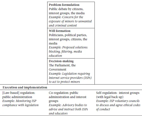 Media policy is a generic name for all decision-making concerning media and communication. In Figure 1.1, the general political process is illustrated with an example of a media-related issue. More can be found on the role of the Council of Europe in Chapter 7, and on Internet regulation and governance in Chapter 8 of this volume.