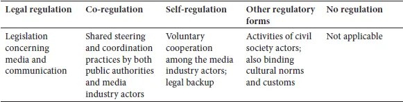 Media regulation includes all the practical means and instruments that are used to implement decisions concerning the media and their use, and to make the subjects of regulation comply with them. Strong regulation is based on legislation, that is, compulsory rules; soft regulation is exercised by self-regulatory means when the actors agree to comply voluntarily absent coercive means. Different forms of regulation can be illustrated by a continuum where one end is represented by legislation and the other by soft regulation. In-between are different forms of co- and self-regulation (see Table 1.2).