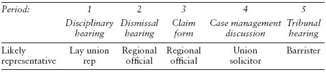 In an ordinary dismissal of a trade union member for misconduct, the responsibility for the claimantâs case might be passed on as illustrated in Table 1.1.