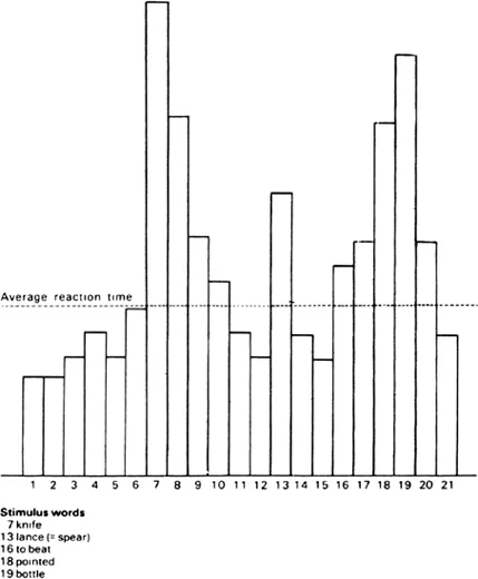 The results of the association test can be illustrated very neatly by a diagram (Figure 5). The height of the columns represents the actual reaction time of the test person. The dotted horizontal line represents the average mean of reaction times. The unshaded columns are those reactions which show no signs of disturbance. The shaded columns show disturbed reactions. In reactions 7, 8, 9, 10, you observe for instance a whole series of disturbances: the stimulus word at 7 was a critical one, and without the test person noticing it at all three subsequent reaction times are overlong on account of the perseveration of the reaction to the stimulus word. The test person was quite unconscious of the fact that he had an emotion. Reaction 13 shows an isolated disturbance, and in 16–20 the result is again a whole series of disturbances. The strongest disturbances are in reactions 18 and 19. In this particular case we have to do with a so-called intensification of sensitiveness through the sensitizing effect of an unconscious emotion: when a critical stimulus word has aroused a perseverating emotional reaction, and when the next critical stimulus word happens to occur within the range of that perseveration, then it is apt to produce a greater effect than it would have been expected to produce if it had occurred in a series of indifferent associations. This is called the sensitizing effect of a perseverating emotion.
