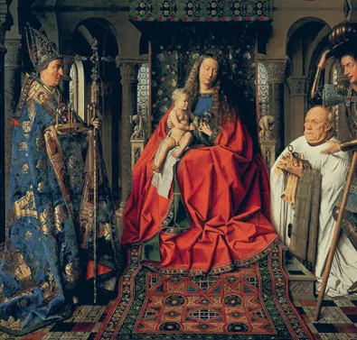 The Madonna and Child are sitting in a space so cramped there is hardly room for their visitors: St Donatien on the left in a blue and gold cope, St George on the right in a cacophonous suit of bronze armour. George is a bumptious figure, disturbing the peace and treading clumsily on the vestments of the old cleric kneeling beside him, namely Canon van der Paele, who has commissioned the picture and is even now being introduced to the Virgin.