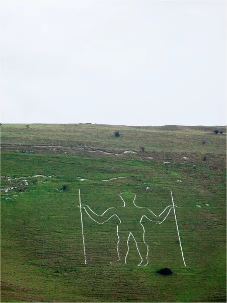 Some hill figures have been resurrected by nineteenth-and twentieth-century archaeologists – whose enthusiasm has almost certainly changed the original outlines. The Long Man of Wilmington is one, a familiar figure to me after my father moved from Cowden to Eckington Manor, in the village of Ripe, overlooking the broad sweep of the South downs in Sussex. The Long Man of Wilmington, or the Wilmington Giant, is a 70-metre-high figure holding what appear to be two staves on either side of him, cut into the downland turf on the slope of Windover Hill, between two spurs of lands that face north towards the weald. He is one of the largest such representations of a man anywhere in the world, beaten only by the Attacama Giant in Chile.