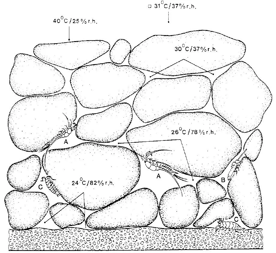 Microclimate: temperature and humidity gradients in a stony habitat in strong sunlight, and the effects on positions occupied by various small arthropods; A = bristle-tail, B = springtail, C = woodlouse. The temperature decreases from the top downwards while the relative humidity increases. When the stones are shaded, the bristle-tails move to the underside of the upper stone layer. (Adapted from G. Eisenbeis 1983.)