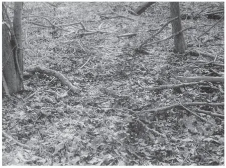 Leaf litter, twigs and branches in a mixed oak/ash woodland in spring. Note that oak leaves remain but all the ash leaves have disappeared. (Photograph B.N.K.D.)