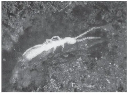 Section through soil humus impregnated with agar jelly showing the ‘primitive’ insect Campodea staphylinus (Diplura). This species is colourless and blind but has highly developed tactile senses. It does not burrow but moves through the soil cavities using its antennae to locate a pathway when moving forward, and its equally well-developed posterior feelers’ (cerci) when moving backward under confined conditions. (Photograph J.M. Anderson.)