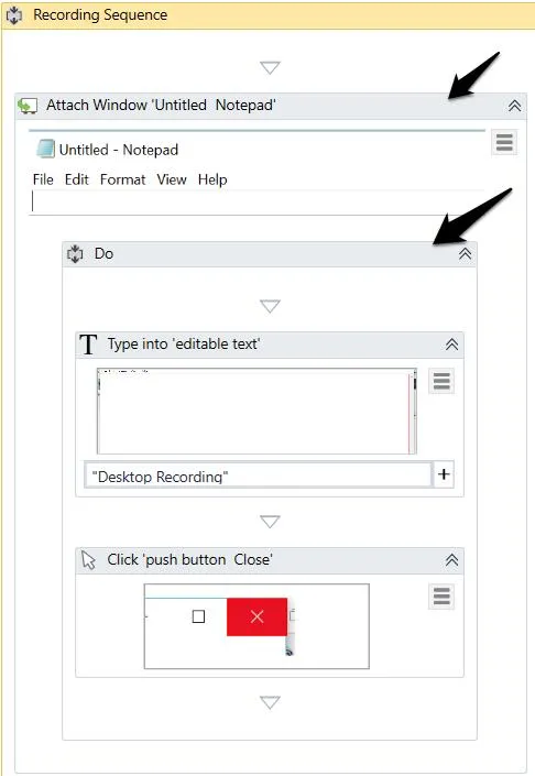 - Double-click on the Attach Window activity. Click on Click Window on Screen and indicate the Notepad window. The Notepad window is now attached to the previous activity: