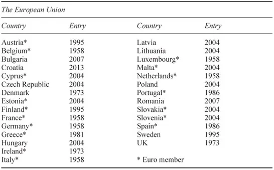 There was never a plan guiding progress toward European integration. Circumstances, mostly unexpected and usually of an urgent kind (e.g., the oil crises of the 1970s), were exploited as opportunities to build more solid connections across the continent. Over the next half century, membership reached 28 countries (see Table 1.1) – with Croatia joining in 2013 – and, at the same time, a series of treaties expanded the EEC’s scope of authority. The Single Europe Act (1987) launched the “single market” in which almost all non-tariff barriers, such as product regulations that blocked goods from entering a country, were eventually removed to enable the free movement of people, goods, and services across national borders. Transportation throughout Europe, for the most part, has become as easy as travel within the United States. The Maastricht Treaty (1992) brought far-reaching reforms that amounted to a fundamental transformation: citizens could vote and hold office in any other member state; a single currency (euro) was proposed; the organization was renamed the European Union (EU); a mechanism for a common foreign and security policy was devised; and greater collaboration on matters of justice and home affairs (e.g., immigration, drug trafficking, customs, international fraud, and terrorism) was promised. The Treaties of Amsterdam (1997) and Nice (2003) assigned additional powers to the EU and made decision-making somewhat more efficient. The euro currency began circulating in 2002 among 12 member states and currently is in use by 17 EU countries. An attempt to consolidate the treaties into a single constitution with a more streamlined administration failed when France and the Netherlands rejected it in 2005, although the Lisbon Treaty (2009) adopted the provisions related to certain leadership positions such as in foreign and security policy.