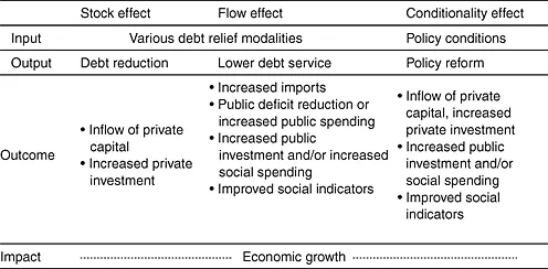 The intervention theory of the possible effects of debt relief is the following. If debt relief is to promote economic growth, this can in principle occur in three ways. First, debt relief can lead to a reduction of the debt stock (output) and thus of the debt overhang, which stimulates private investment and enables the country to regain access to international private capital (outcomes), which in turn may lead to economic growth (impact). This is the stock effect. Second, debt relief can result in a fall in the debt service (output); funds released in this way may lead to additional imports and public expenditure in physical and social infrastructure (outcomes), which also may further economic growth: the flow effect. Third, conditions attached to debt relief may induce policy improvements (output); if the correct conditions have been set, this can lead, for example, via higher public investment and social expenditure (outcomes) to increased economic growth and poverty reduction (impact). This is the conditionality effect of debt relief.