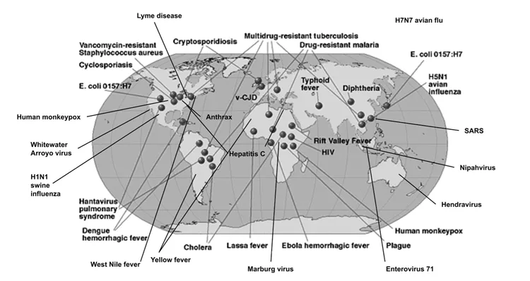 Despite remarkable advances in microbial research during the twentieth century, infectious diseases still remain among the leading causes of morbidity and mortality worldwide. More than three dozen new high-impact infectious diseases have been identified since the 1970s. The list includes Legionnaires’ disease, SARS, HIV/AIDS, Lyme disease, hepatitis C, new forms of cholera, cryptosporidium, Ebola, toxic shock syndrome and E. coli 0157:H7, among many others. With this in mind, emerging infectious diseases may serve as a paradigm for handling the public threat of bioterrorism. Figure 1.1 shows the global distribution of some of these agents.