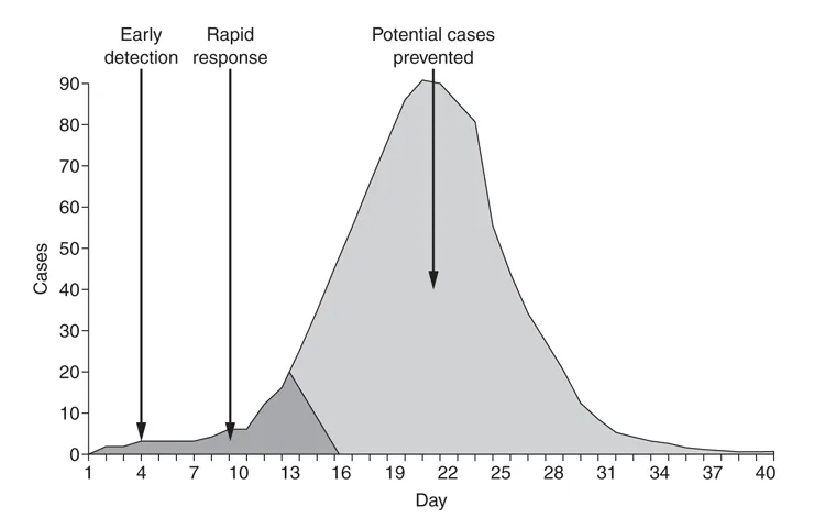 Destructive bioagents can linger (e.g., smallpox) or appear, disappear, and reappear without warning (e.g., plague or influenza). Will a biological threat agent like non-contagious anthrax cause more or less harm than contagious agents like pneumonic plague, smallpox, or a hemorrhagic fever virus? Understanding these diseases will help us better prepare for them, avoid them or, at a minimum, diminish their impact. Figure 1.2 shows how the epidemic curve of cases over time could be affected with an efficient response mechanism.