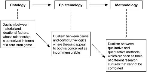 At the level of methodology, dualistic thinking takes the form of a sharp divide between qualitative and quantitative methods. The debate between proponents of each of the associated research traditions is as heated as those at the ontological and epistemological level to the extent that comparisons between them sometimes call to mind religious metaphors (Mahoney and Goertz 2006; Moses and Knutsen 2007). This is hardly surprising once we realise that this distinction is fuelled by sharp philosophical assumptions according to which qualitative methods are associated with an idealist ontology and a constitutive/interpretative epistemology, while quantitative methods are associated with a materialist ontology and a causal/explanatory epistemology. While fully acknowledging the importance of the directional dependence between ontology, epistemology and methodology (Hay 2002), and despite our own insistence on their consistency, we have to recognise the inconclusiveness of the philosophical assumptions informing contending methodological persuasions. In this context, it might be âworthwhile to set aside the quest for uniform methodological tenets in favour of greater methodological pluralism, shifting the focus from common rules or standards to a common appreciation of the trade-offs involved in pursuing different methods and research productsâ (Sil 2000: 500).