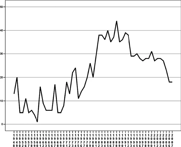 The first dependent variable is the number of the GAās draft proposals about the ArabāIsraeli conflict. This variable was preferred instead of the number of resolutions because the aim of the research is to explain the mechanisms of decision making within the UN, and not only the output activity. As noted in the research framework, in order to understand fully the variation of the UN output (resolutions), it is necessary to investigate the āblack boxā of the decision-making process. Data on roll calls regarding the ArabāIsraeli conflict have been obtained from two sources. The proposals made in the GA during the period 1948ā82 have been extrapolated from the database of the ICPSR āUN roll-call Data 1946ā1985.ā Those votes tallied in the GA during the period 1983ā2007 were computed using the documents of the UNISPAL and the UNBISNET resources. The total amount of drafts voted in the period 1947ā2007 was 1176. Their number varied over time, showing an evident positive increase since the early 1970s, and again during the decade 1982ā92 (see Figure 1.1).