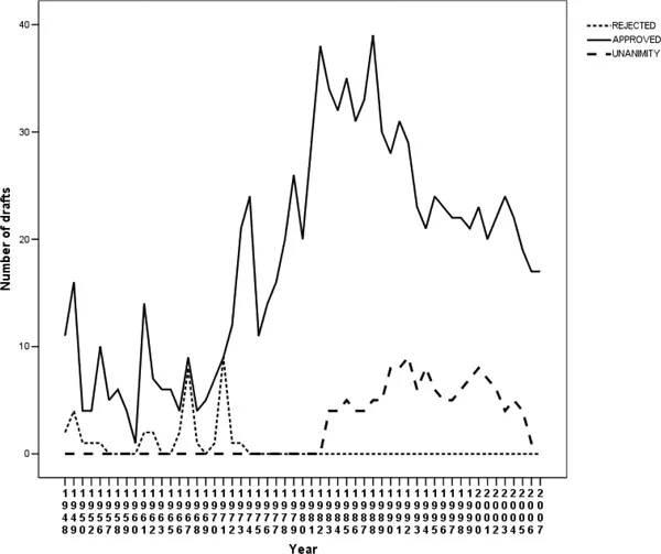 Only 3 percent of those roll calls were refused whilst 97 percent were approved (11 percent in unanimity). The GA rejected roll calls up until the early 1970s, while the unanimous votes have been counted from 1983 on (see Figure 1.3).