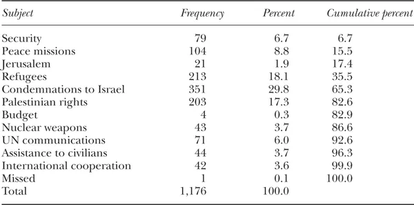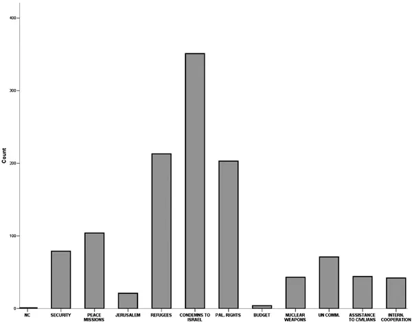 Looking at the number of roll calls by subject, it is possible to observe that types 4, 5, and 6 have more roll calls than the others, and represent approximately 71 percent of the total. In particular, the category ācondemnations of Israeli violations of human rightsā is over 30 percent of all the drafts. Types 1, 2, and 9 also have a conspicuous number of drafts, while the remaining categories (3, 7, 8, 10, and 11) represent only 2 percent of the total number of proposals presented in the GA (see Table 1.3).