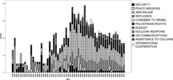 Figure 1.1 Number of draft proposals in the GA about the ArabāIsraeli conflict, 1948ā2007