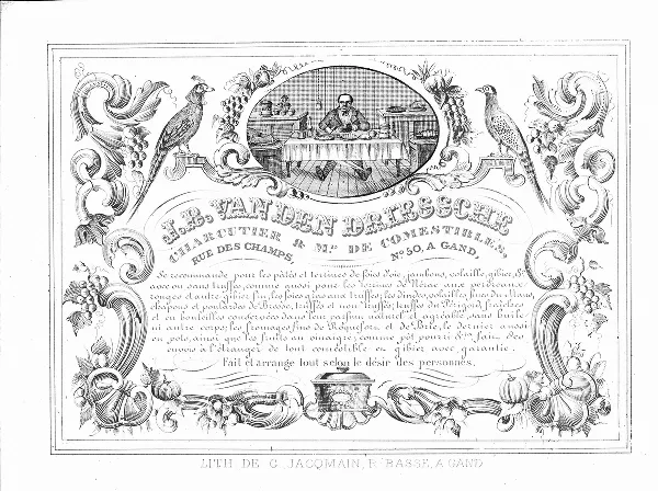 An illustrated advertising postcard from a Belgian butcher and food shop from the mid-nineteenth century is decorated with colorfully plumed birds, clusters of grapes, and an iron cooking pot on the bottom. A petite oval at the top, as if a window into an upper-class home, shows a nattily dressed gentleman sitting at a table with knife and fork in hand, preparing to dig into a feast of fancy foodstuffs. The caption, in French, lists all the meats, cheeses, pâtés, and other items that are available for purchase from the shop, which promises that everything will be prepared “according to the customer’s desire.”1