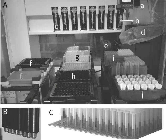 Laboratory robots are essential tools for handling high numbers of samples. Simultaneous assay of hundreds of samples is often performed in 96-, 384-, or 1536-well plates (Figure 1.1). Manual handling of 384- or 1536-well plates or several 96-well plates in parallel is impractical if not impossible (Figure 1.1) [1, 2]. Therefore, automated liquid handling is necessary for actual high throughput. Adequate programing will allow one to perform an experimental protocol simultaneously in a high number of samples. Currently, automated liquid handlers, dispensers, and workstations can effectively dispense liquids with high precision and good reproducibility in 96-, 384-, or 1536-well plates (for a review of liquid-handling technologies and principles see [2]). Automated workstations also perform sample transfer, tip replacement, incubations or mixing and shaking, depending on the device design and programing (Figure 1.2A). These instruments have pipetting arms with many-channel heads that allow parallel transfer of samples or reagents (Figures 1.2B and 2C). They are often endowed also with gripper arms to perform different tasks such as moving labware (tubes or plates) to different points of the station or removing plate lids. The pipetting and gripper arms can move along X-, Y-, and Z-axes across a stationary deck. In some instruments volume measurement systems have been incorporated as feedback quality controls for precision and accuracy of pipetting or dispensing [2].