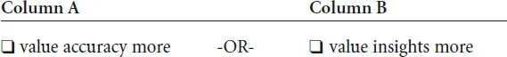 Which do you prefer most of the time? Accuracy or insights? Put a checkmark in the box next to âaccuracyâ or âinsightsâ and move on to the second set of choices below it. You may not check off both boxes; check only the box where you have a slight or strong preference.