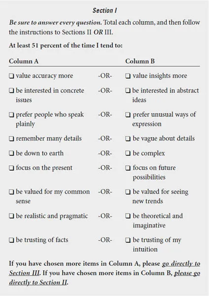 Choose your answer from either Column A or Column B. Each choice must be filled in, choosing the statement that describes you at least 51 percent of the time. You should wind up with a total of nine checkmarks in each of the sections (I, II, and III).