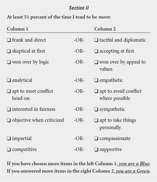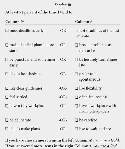 The theory behind the Color Q system has been tested for decades on millions of people worldwide. For many individuals, including both authors of this book, the system has been career and life changing. The following self-assessment test is your key to this very powerful (and actually rather fun) professional and personal tool.