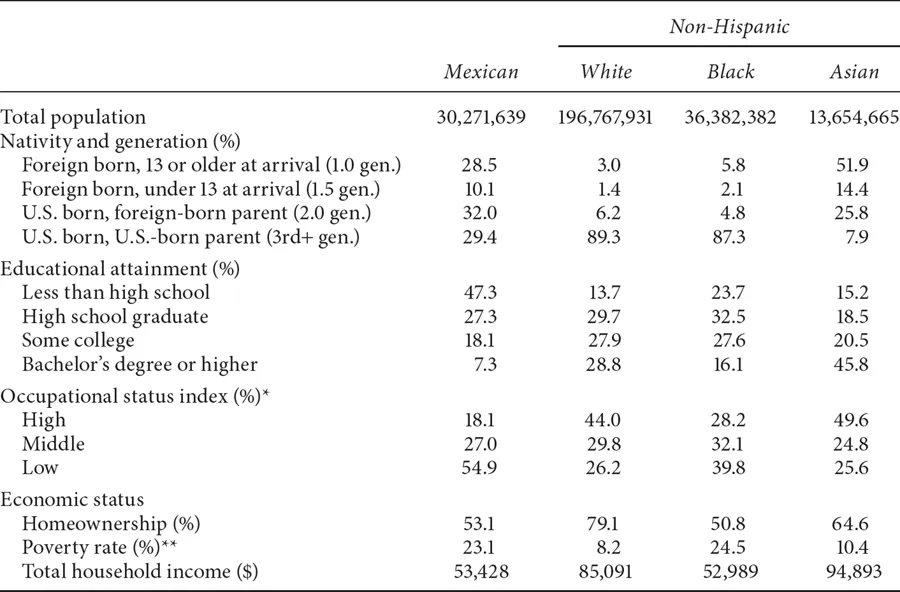 The Mexican American respondents in this book are all employed in white-collar occupations or own businesses, and all make incomes well over the national median. Nearly three quarters of the respondents hold a combination of three middle-class indicators, and a quarter hold all four. Before I discuss the characteristics of my sample in greater detail, it is important to contextualize the middle-class Mexican American populations in the United States and in Los Angeles, California, the metropolitan region where this study is based. Table 1 details the nativity and generation, educational attainment, occupational status, and economic status (measured by homeownership, poverty rate, and total house hold income), by race and ethnicity for the United States using data from the 2008 Current Population Survey.4 At the national level, the Mexican-origin population exhibits the lowest levels of education of any other racial or ethnic group. Only 7.3 percent of Mexican Americans hold a bachelorâs degree or higher, compared to 28.8 percent of whites, 16.1 percent of blacks, and 45.8 percent of Asians. Mexican Americans are also the least likely of all groups to be employed in middle- (service and skilled blue-collar jobs) to high-status occupations (professional, technical, white-collar occupations) and are overly concentrated in low-wage labor, as measured by the Duncan Socioeconomic Index (SEI), which scores jobs according to occupational prestige. At 53.1 percent, Mexican Americans have rates of homeownership that are slightly higher than that of African Americans (50.8 percent), but much lower compared to those of Asians (64.6 percent) and whites (79.1 percent). The Mexican American poverty rate is slightly lower than that of African Americans, and Mexican Americans barely surpass African Americans in total house hold income. In the aggregate, Mexican Americans appear to be a poor and uneducated disadvantaged ethnic group. However, these larger trends are artifacts of high levels of unauthorized and low-wage Mexican migration to the United States during the last half of the twentieth century that mask the progress of the relatively small but nonetheless significant proportion of Mexican Americans who are achieving middle-class status.