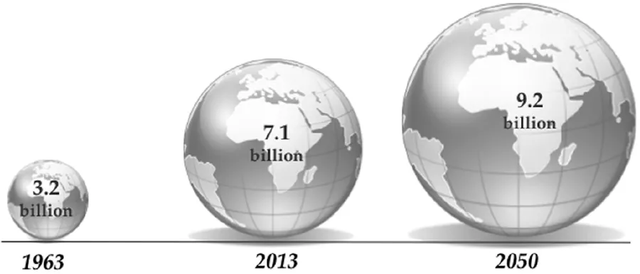 Demographics are also an argument for bringing together business and the BoP. The planet is getting more and more crowded. The worldâs population will increase by another 2 to 3 billion people in the next thirty years, and most of those new additions will be part of the BoP.11 The magnitude of this growth in human population can be hard to comprehend. A way that I have found helpful is to consider the human population growth in the span of one lifetime, as illustrated in Figure 1.1. Imagine someone born in 1963, when world population was about 3.2 billion. By the time he or she turned fifty, the population on the planet had more than doubled: an increase of nearly 4 billion people in that half-century. Assuming this person lives for eighty-seven years, the population during his or her lifetime will have nearly tripled, with an additional 6 billion people having been added to the human head count in a single lifetime,.12 And again, most of this growth will likely have occurred in the BoP socioeconomic segment.