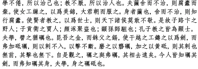 Learning is like sharpening. (Suppose fine) copper from Mount Kunwu and (excellent) tin from Zhufu are worked by the (famous) blacksmiths of Gan and Yue and forged into a sword. Yet (if they) do not use (both) fine and course whetstones (on it), then (when) using (it) to stab, (it) will not enter; and (when) using (it) to slash, (it) will not cut. (But if they) sharpen it with a course whetstone, and add to this with a fine whetstone, then its jabbing will have nothing (that can) withstand (it), and its slashing will have nothing (that will not) fall before (it). (If you) consider it this way, the diference between sharpening and not sharpening (clearly) is great. Nowadays, people all know to sharpen swords, but no one knows to sharpen themselves. Learning is the sharpening of the self.3